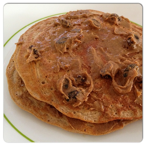 - Spread 1/2 tbsp of Cinnamon Raisin Swirl peanut butter onto each pancake.